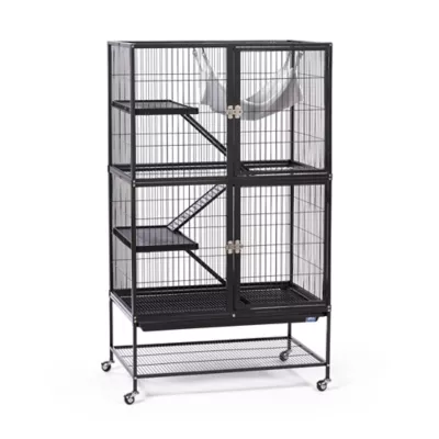 Our two story modular Ferret Stack Home is expandable when your pet needs more space. This two story cage offers plenty of space for energetic adult ferrets to run, jump and play. Includes plastic ramps and platforms, plush hammock and features a removable grille, pull-out debris tray, integrated storage shelf and easy rolling casters. The large half-cage front door measures 15 inches wide and 19.25 inches high and features an escape-proof door lock. Platforms, grille and bottom tray are all easily removed for convenient cleaning. Space saving shelf holds toys, treats and supplies. Cage measures 31 inches long, 20 inches wide and 40 inches high (54 inches including stand), with 7/8 inches wire spacing. When your ferrets outgrow their cage, our modular Ferret Stack cage system allows you to add a level, expanding as necessary. Available in four sizes, each cage measures 31 inches long and 20 inches wide with 7/8 inch wire spacing.