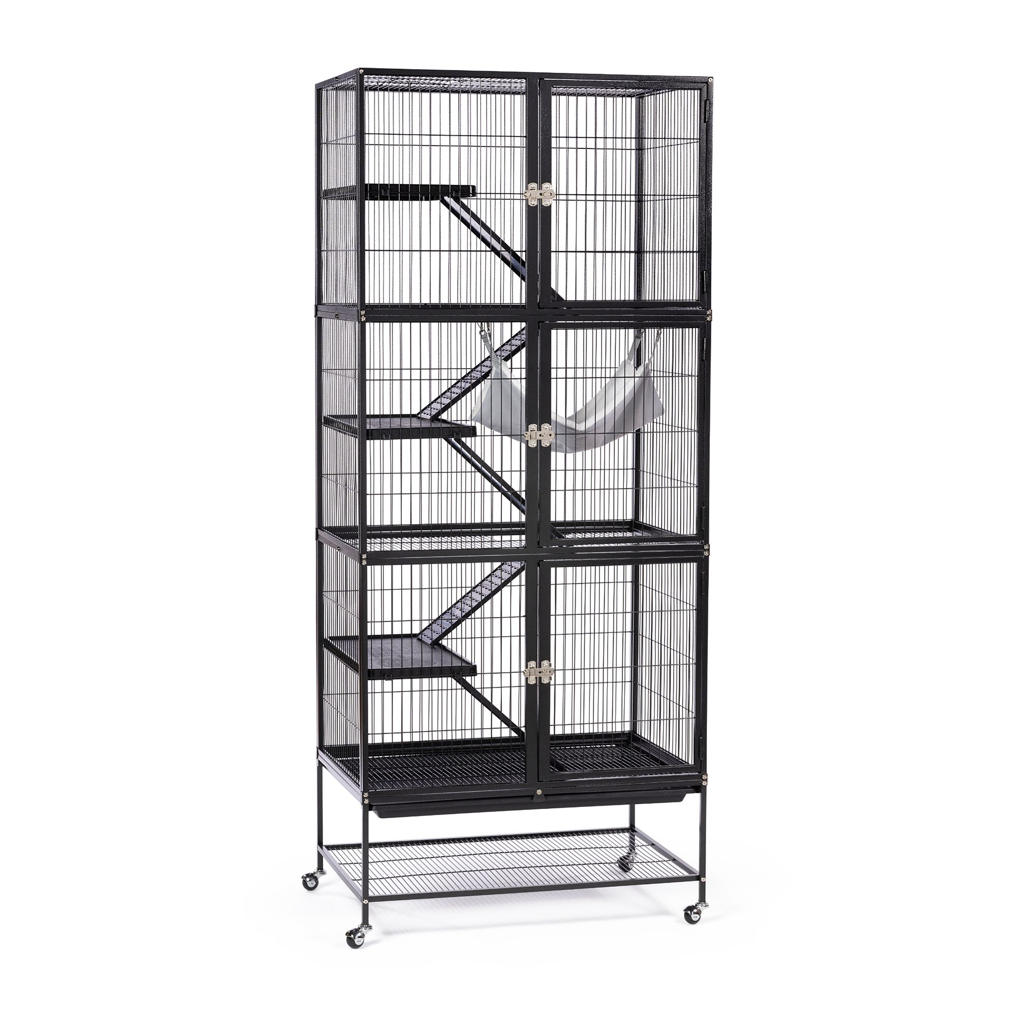 Our two story modular Ferret Stack Home is expandable when your pet needs more space. This two story cage offers plenty of space for energetic adult ferrets to run, jump and play. Includes plastic ramps and platforms, plush hammock and features a removable grille, pull-out debris tray, integrated storage shelf and easy rolling casters. The large half-cage front door measures 15 inches wide and 19.25 inches high and features an escape-proof door lock. Platforms, grille and bottom tray are all easily removed for convenient cleaning. Space saving shelf holds toys, treats and supplies. Cage measures 31 inches long, 20 inches wide and 40 inches high (54 inches including stand), with 7/8 inches wire spacing. When your ferrets outgrow their cage, our modular Ferret Stack cage system allows you to add a level, expanding as necessary. Available in four sizes, each cage measures 31 inches long and 20 inches wide with 7/8 inch wire spacing.