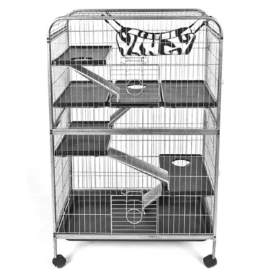 The WARE Living Room Series Critter Home offers the ultimate in pet comfort, complete safety, and convenient cage cleaning. Built strong to last long with heavy duty tubular steel construction and chew proof welded steel wire. Plastic pull pan is full size and makes clean-up easy. Two locking front doors and two full opening side doors allow for easy access to entire cage. Solid surface shelves and ramps are also easy to clean and provide safe access to each level. The cozy critter hammock is washable and offers the ultimate in comfort for your pet. Bar spacing is 1 inch.