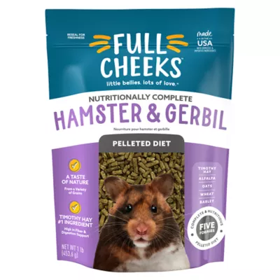 Full Cheeks Hamster & Gerbil Pelleted Diet is made from Timothy hay and other select ingredients in a solid, pelleted form to provide whole, deliciously consistent nutrition for your pet. We believe caring for your furry little one should be as easy as loving them. And now it can be. Our nutritious diets make it simple to fill their cheeks and little bellies, so all they need to do is what they do best: Give lots of love. Only at PetSmart.