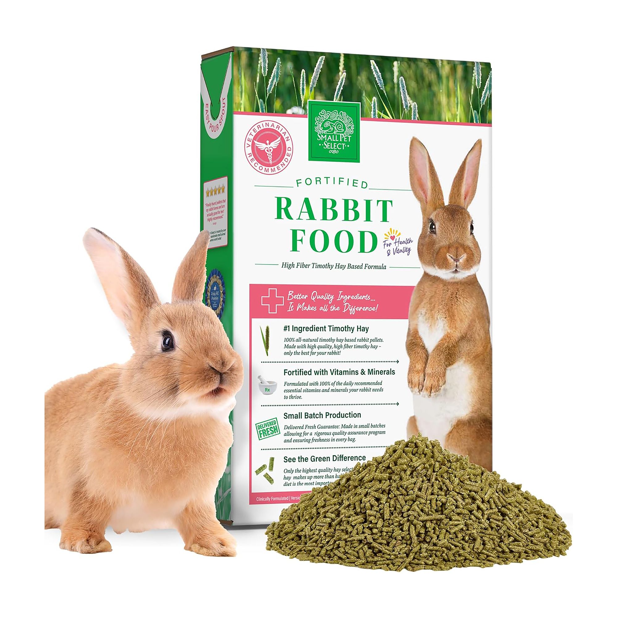 Description and Overview: Get your paws on the best Non–GMO premium quality Timothy–based rabbit food on the market. Our Non–GMO Timothy hay rabbit pellet fortified with all essential vitamins and minerals that your bun needs. Small Pet Select rabbit food pellets are made in small batches with only the finest ingredients, including our very best hand–selected Timothy hay. (We actually go to the fields to choose the hay we offer. And our CEO has 20⁄20 vision. No joke.)Pellets can be such a great supplement for your rabbit's diet. Although hay is the most important part of your rabbit's diet (really, it's #1), when you want to provide a little extra nutrition, pellets could be your answer. We recommend feeding with Small Pet Select Timothy hay, freshwater (always!), and moderate amounts of fresh veggies. Stay away from junky big–box pet store rabbit pellets; they're packed with unsafe ingredients and can cause obesity, teeth issues, and other scary things. While the mixes may look appealing, they don't have the nutrients your rabbit deserves. And needs. You won't be sorry your rabbit tried this stuff. And they won't be sorry, either .P.S. There are no nuts in our premium rabbit food pellets. Be aware, though, that they are manufactured in a facility that processes nuts.