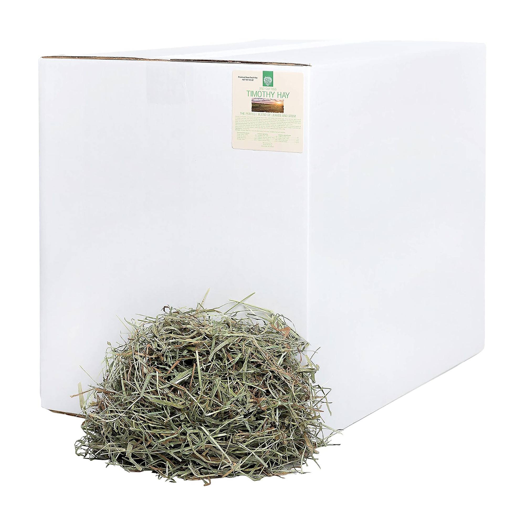 Features & Benefits: – 1st Cutting Timothy Hay is an Excellent Source of Fiber– This Cutting Tends to be High in Stem, Low in Leaf– 1st Cutting Timothy Hay Refers to the First Harvest of Hay from a Timothy Grass Field, Typically Occurring in Late Spring or Early Summer.– Excellent Choice For Promoting Healthy Digestion in Small Animals– Farm Fresh Hay– Low Dust – Extra Fresh & Green. Hand–Selected Timothy Hay – We hand–pack each box in small batches to ensure only the highest quality 100% US–grown 1st cut Timothy hay arrives at your door. 1st cut Timothy hay features a higher fiber content and more flower heads than any other cutting. It includes a higher stem content to wear down overgrown teeth and provides a boost in fiber for happy digestive systems, though it is still very soft and leafy. Earth–Friendly Packaging – As small animal owners, we know the importance of packing delicious snacks in safe ways for our small animal companions. No compression packing here that damages stem and leaf integrity, each package is shipped in a high–strength corrugated box for easy storage (and fun digging!).Minimally Handled & Delivered Fresh – Make it easy to provide exactly what your little friend needs with regular shipments of fresh from the farm hay to wear down growing teeth and protect digestive health. Each delivery of premium Timothy hay for rabbits, guinea pigs, and chinchillas includes a great mix of protein, fiber and fat to keep them healthy. Your small pet may not thank you with words, but happy oinks and binkies will make you feel like the pet owner of the year. Great for Bedding – In addition to being a crucial part of many small pet diets, Timothy hay also makes cozy bedding for hamsters, gerbils, mice, rats, ferrets and more. Hay makes a wonderful, fresh smelling alternative that they will love to snuggle into. 100% Satisfaction Guarantee! – For you and your pets. We know pets can be picky. If your bunny (or piggy or chinny) stomps and turns up her nose, you can still rest easy.