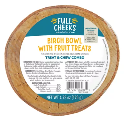 This Full Cheeks Birch Bowl with Fruit Treats is the perfect choice for your small pet. Made with love for rabbits, guinea pigs, hamsters, and most small animals, this tasty treat and chew combo features delicious fruit your small pet will love. We believe caring for your furry little one should be as easy as loving them, and now it can be. Our products are specially made for them, and are designed to be simple for you. All they need to do is what they do best: give lots of love. Only at PetSmart.