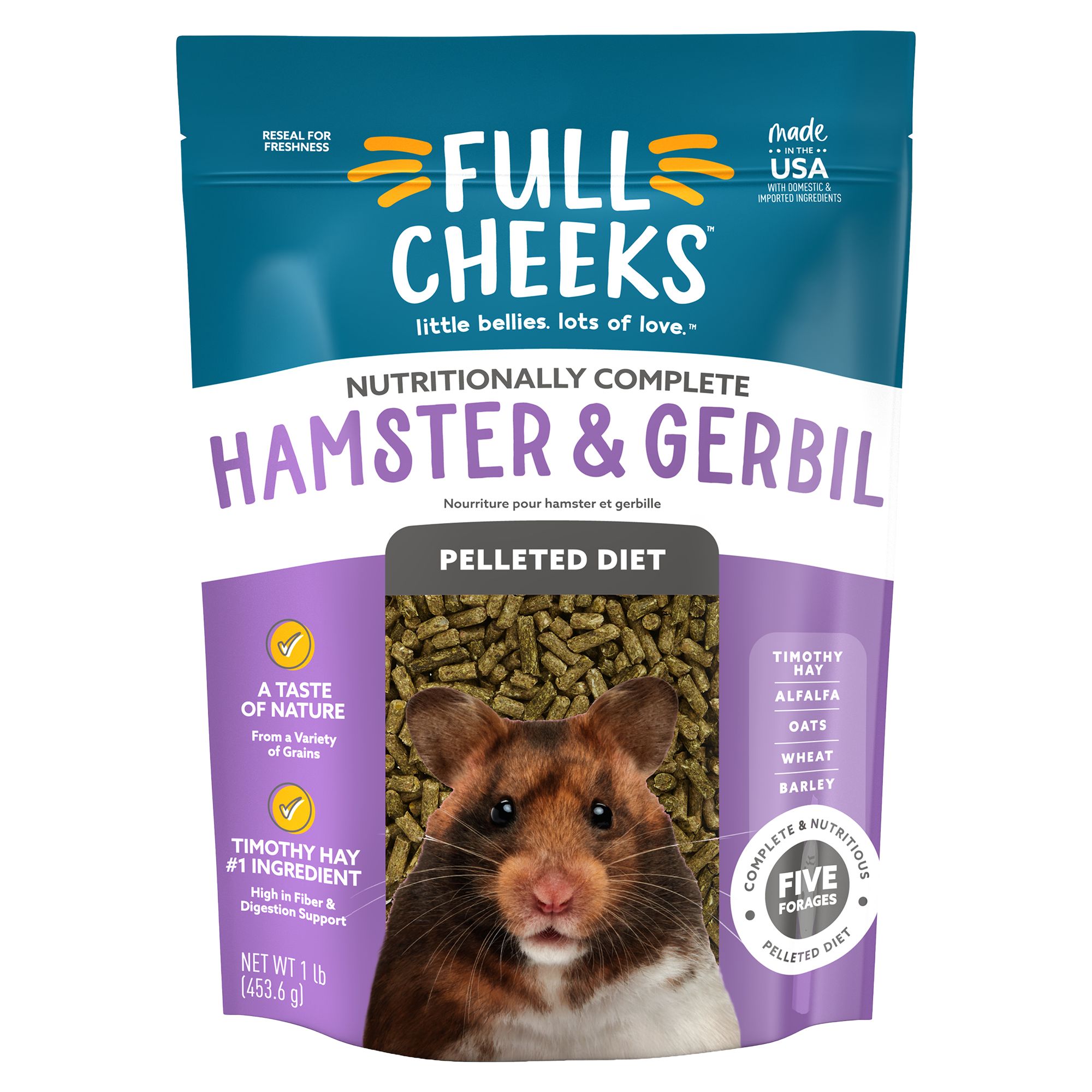 Full Cheeks Hamster & Gerbil Foraging Diet is made with a medley of grains, seeds and vegetables for a delicious mix of flavors and textures that encourages your pet's natural foraging instincts. We believe caring for your furry little one should be as easy as loving them. And now it can be. Our nutritious diets make it simple to fill their cheeks and little bellies, so all they need to do is what they do best: Give lots of love. Only at PetSmart.