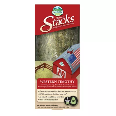 Oxbow Harvest Stacks are the latest in hay innovation. Using special compression technology, we transform 100% all-natural, hand-sorted Oxbow Western Timothy hay into compact, convenient-to-feed portions which produce 80% less airborne dust than loose hay when fed according to instructions. Feed Harvest Stacks as a primary hay source or supplement with loose hay to encourage enrichment. Harvest Stacks make a great feeding option when traveling or anytime storage space is limited.